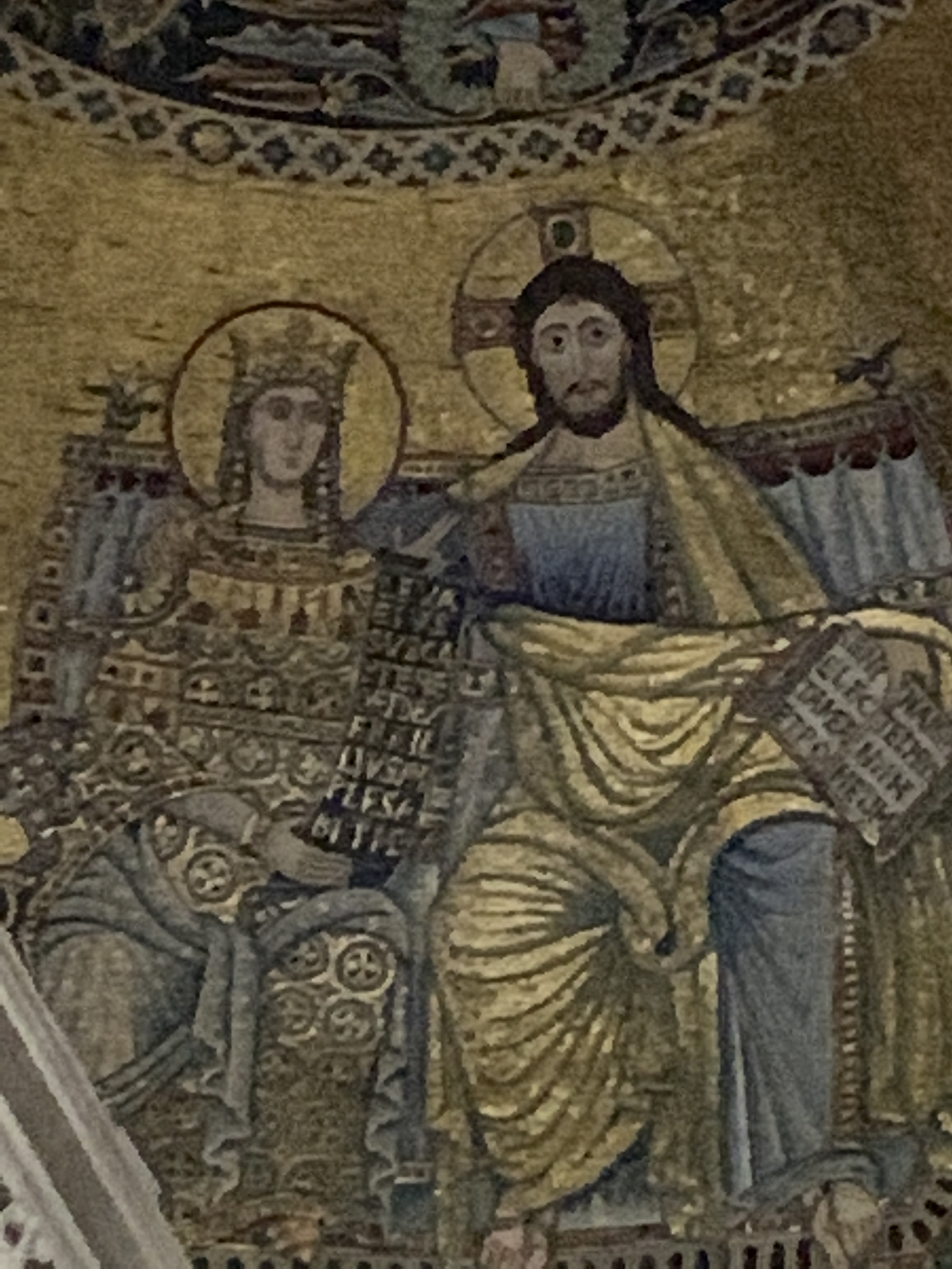Other churches offered fascinating windows into theology, story and the significance of the Trinity, especially Jesus Christ. While there was generally a consistency in the messaging from church to church, occasionally we would find something unexpected. One example is the Basilica di Santa Maria Trastevere, a minor basilica in the enchanting Trastevere neighborhood in Rome. This church is one of the oldest in Rome and includes some amazing mosaics from the 13th century. One of those mosaics, at the front of the church, above the altar, offers a picture of Jesus and his mother, as if both of them are working in concert as intermediaries between earth and heaven: